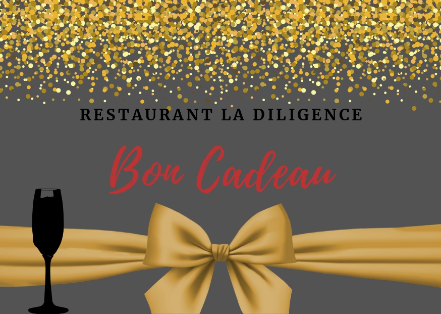 Bon-cadeau Gourmand Apéritif maison offert à vos invités Validité permanente Menu Tradition 25,90 € (entrée, plat et dessert)ouMenu Diligence 39,90 € (entrée, plat, dessert et fromage à choix)ouValeur de votre choix Forfait-Boisson 19,90 €/pers. (vins, eau minérale et café) Message personnalisé et Jolie pochette cadeau